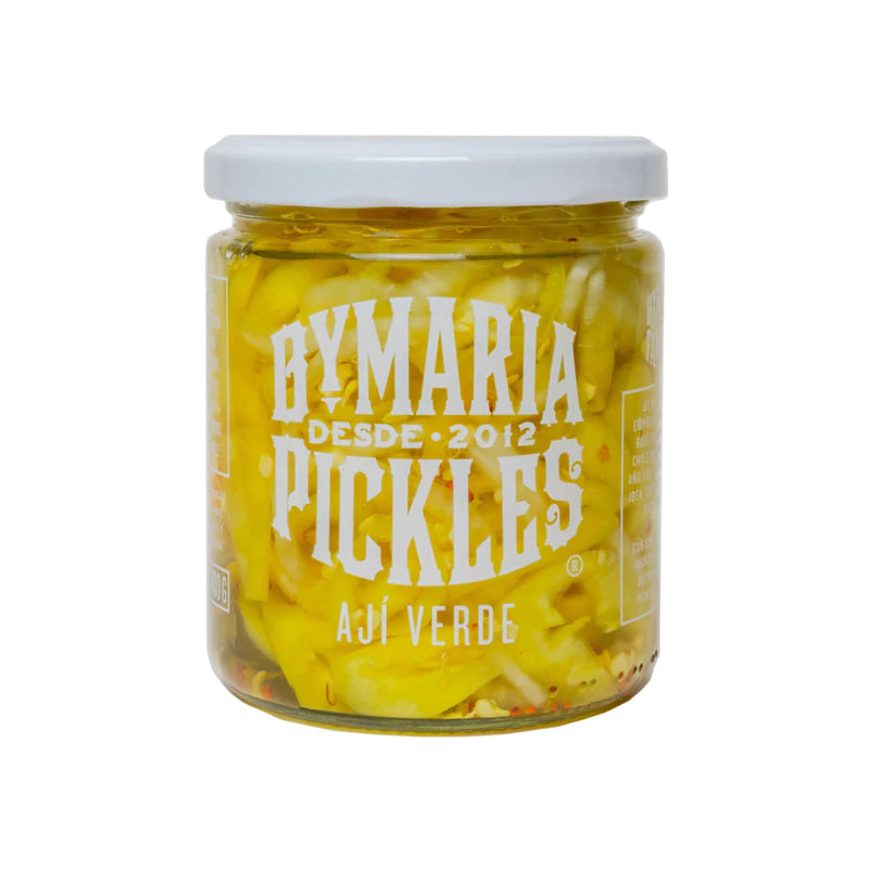 Ají Verde rebanado con un poco de cebolla cortada en pluma y encurtido en vinagre de manzana, especias y semillas de mostaza negra maceradas en pisco.